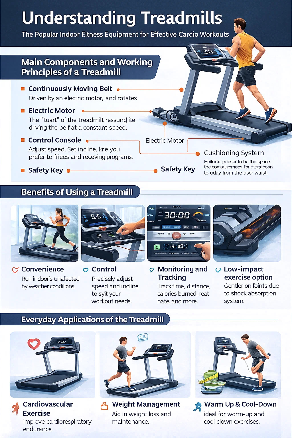 يتكون جهاز المشي عادة من عدة أجزاء رئيسية تعمل معًا لمحاكاة تجربة الجري في الهواء الطلق: