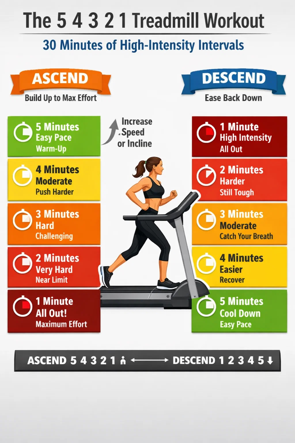 إن فهم ما يحدث في كل فترة زمنية يساعدك على معايرة مجهودك بشكل صحيح وتحقيق أقصى استفادة من كل دقيقة تقضيها على جهاز المشي. إليك كيفية تنظيم التمرين النموذجي 5 4 3 2 1 من البداية إلى النهاية.