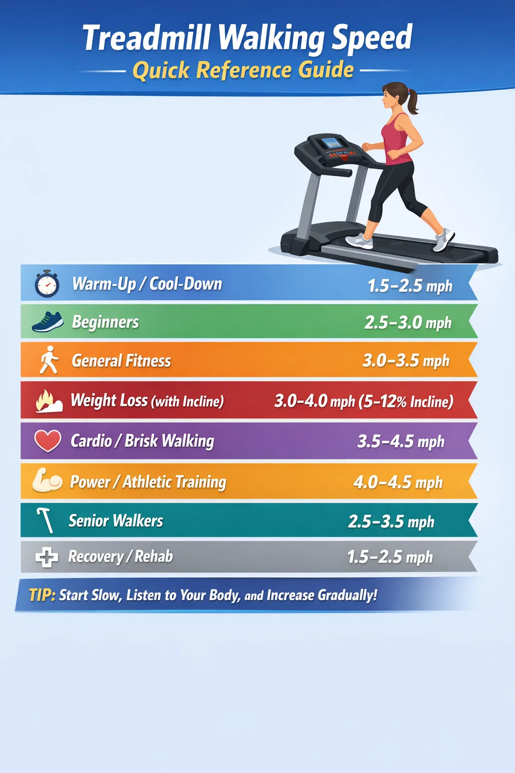 بالنسبة لمعظم البالغين، تتراوح سرعة المشي الجيدة على جهاز المشي بين 2.5 و4.0 ميل في الساعة (4.0-6.4 كم/ساعة) . يغطي هذا النطاق كل شيء بدءًا من نزهة مريحة إلى وتيرة سريعة وهادفة تعمل على رفع معدل ضربات القلب دون الحاجة إلى الركض. إذا كنت تريد رقمًا واحدًا يبدأ به، تعتبر السرعة من 3.0 إلى 3.5 ميل في الساعة هي النقطة المثالية على نطاق واسع للبالغين الأصحاء الذين يتطلعون إلى البقاء نشطين، وحرق السعرات الحرارية، وتحسين صحة القلب والأوعية الدموية.