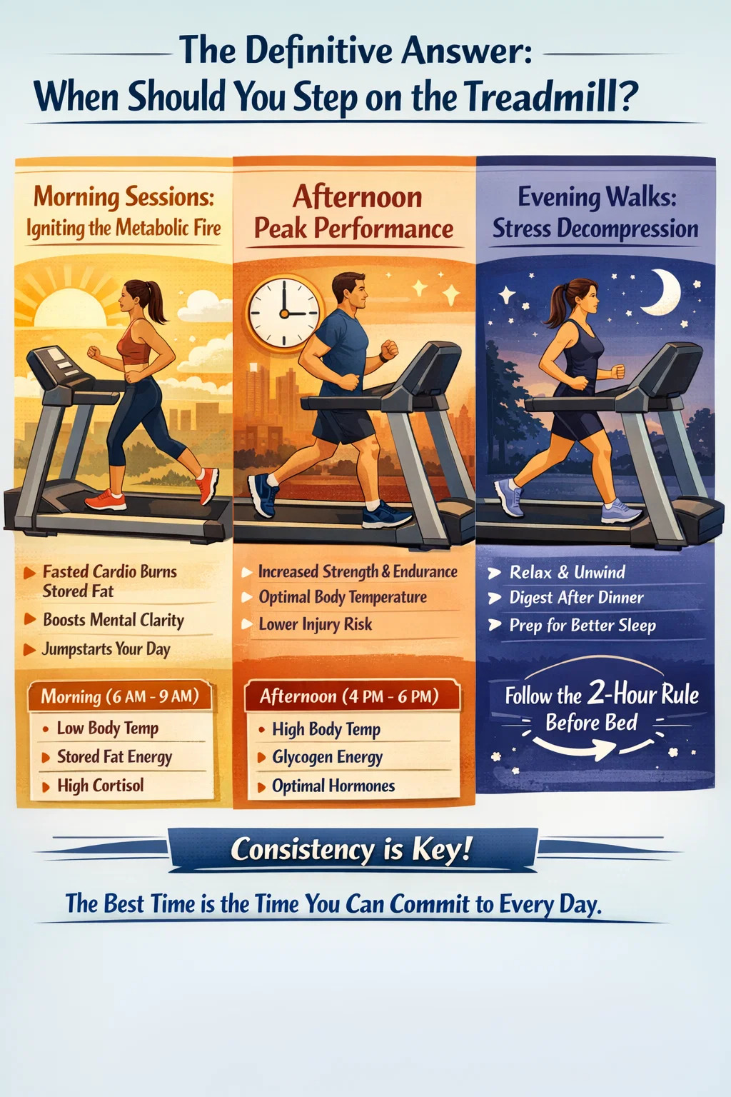 أفضل وقت على الإطلاق للمشي على حلقة مفرغة يعتمد على هدفك الأساسي: من أجل الحد الأقصى لفقدان الدهون الصباح الباكر على معدة فارغة يعتبر مثاليًا؛ ل ذروة الأداء البدني والوقاية من الإصابات، يكون وقت متأخر بعد الظهر (بين الساعة 4:00 مساءً و6:00 مساءً) أفضل. ومع ذلك، فإن الوقت الأكثر فعالية هو في النهاية الساعة التي يمكنك الالتزام بها باستمرار كل يوم. الاتساق يتفوق على التوقيت في كل معادلة لياقة طويلة المدى.